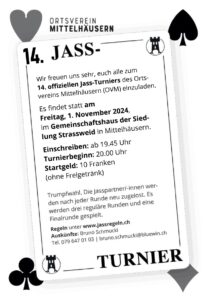 Das traditionelle Jassturnier des Ortsvereins Mittelhäusern findet jeweils am 1. Freitag im November ab 19:30 statt.